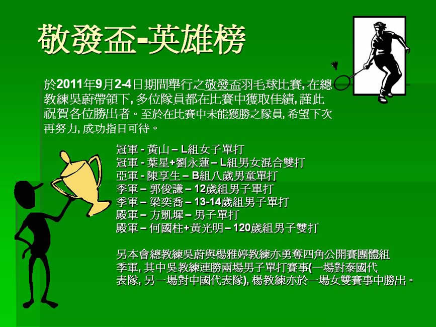 本球會在第七屆敬發盃羽毛球比賽中勇奪七個獎項